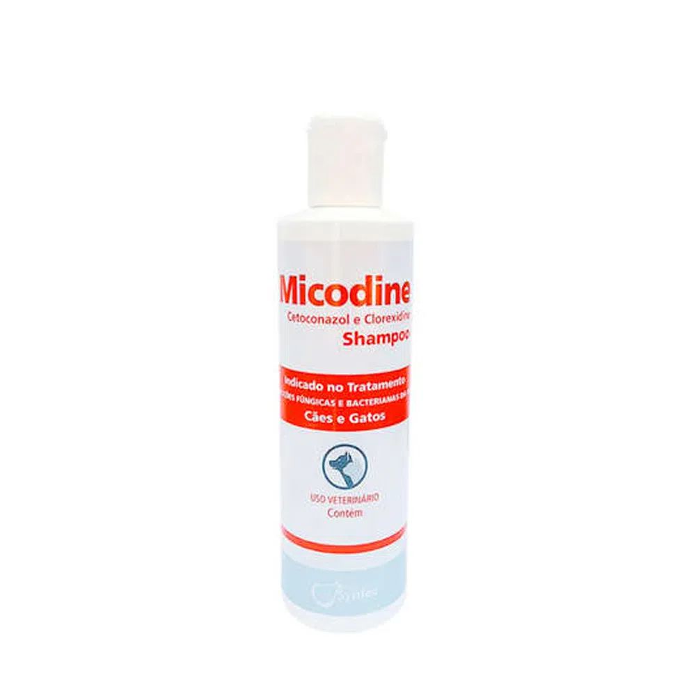 O Micodine Shampoo Syntec é um shampoo dermatológico que associa uma ação fungistática do cetoconazol com a ação antimicrobiana do gliconato de clorexidina. O shampoo micodine para cachorro pode ser usado para o tratamento de afecções da pele em cães e gatos, se forem causados por fungos e bactérias.